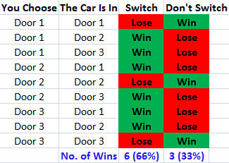 As you can see, it is evident that when you Switch Doors, you win a car 66% of the time.